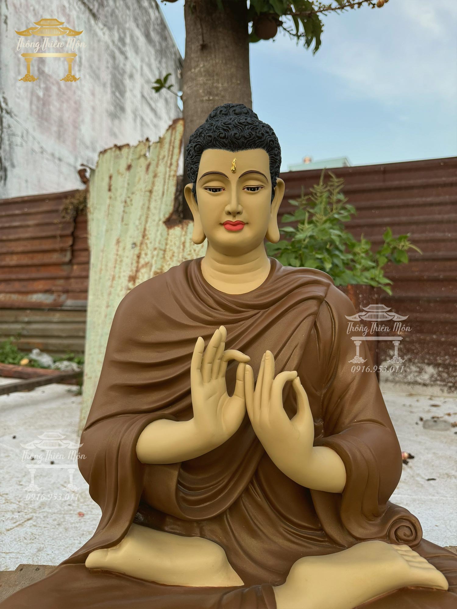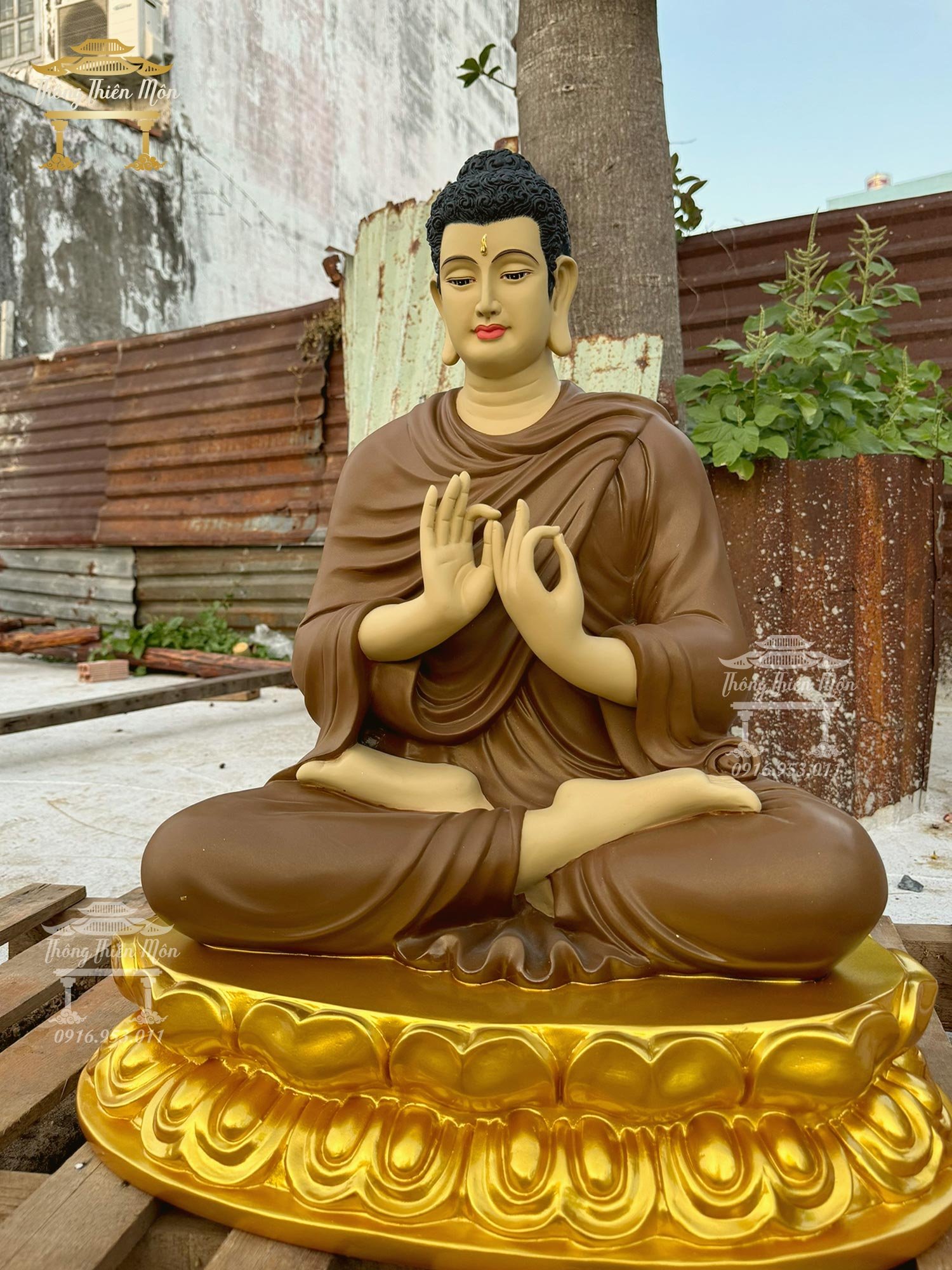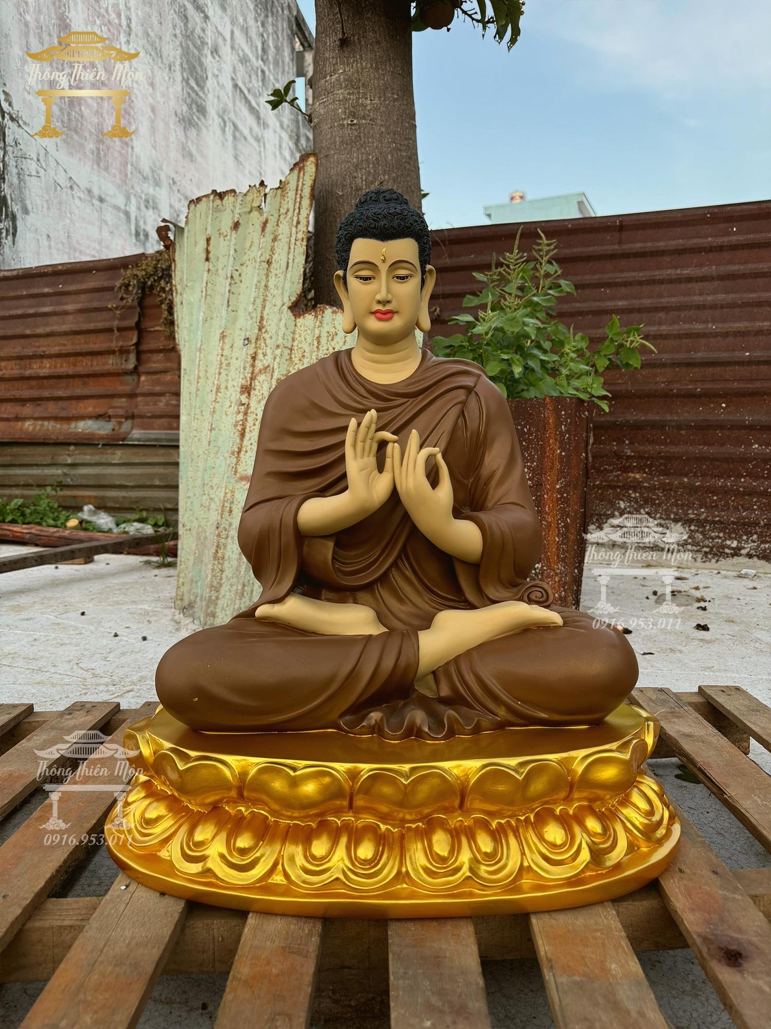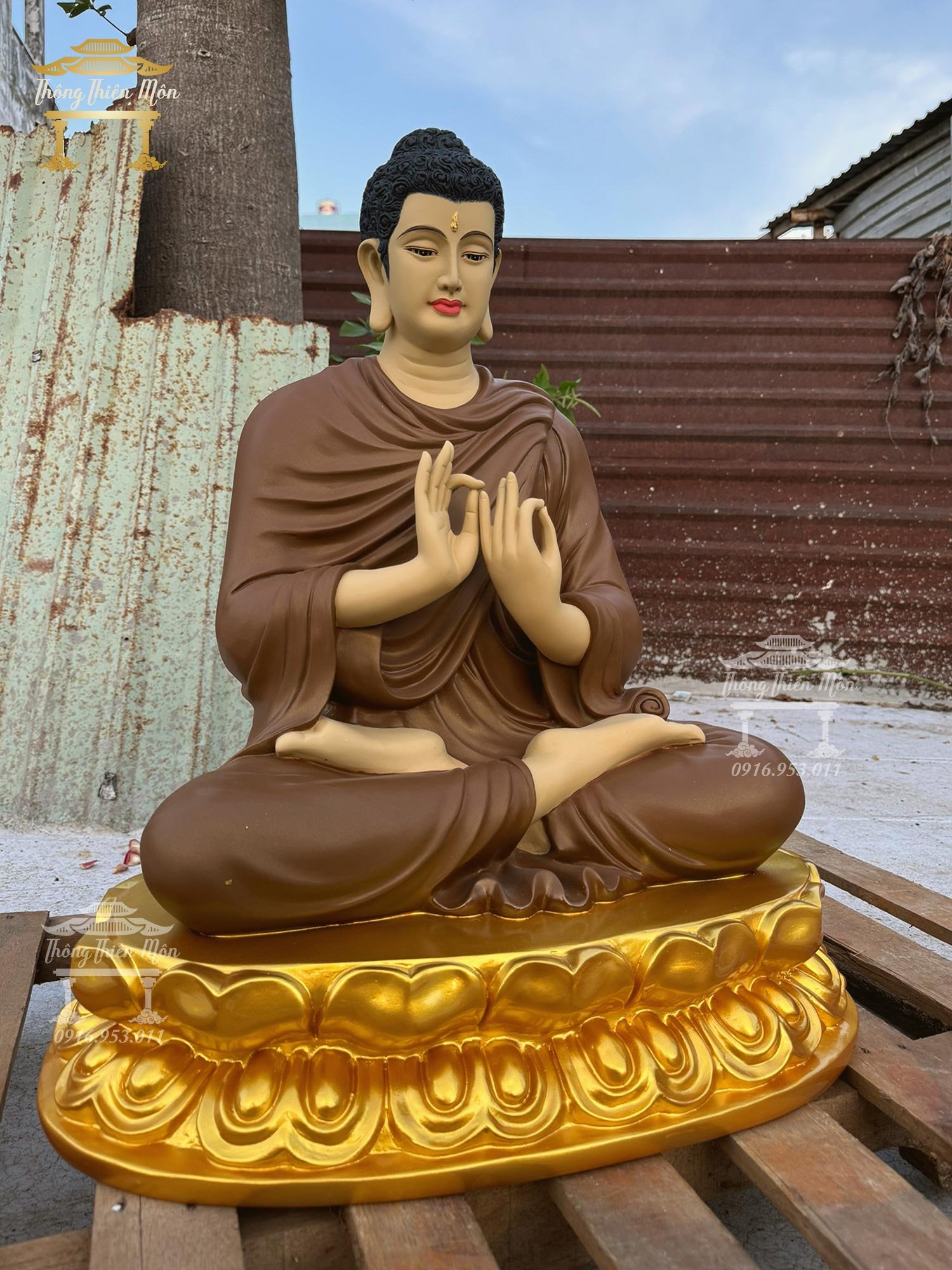 Tôn tượng Bổn Sư Thích Ca Ấn Chuyển Pháp Luân - Kích thước 70cm - Y nâu, đế sen vàng nhũ