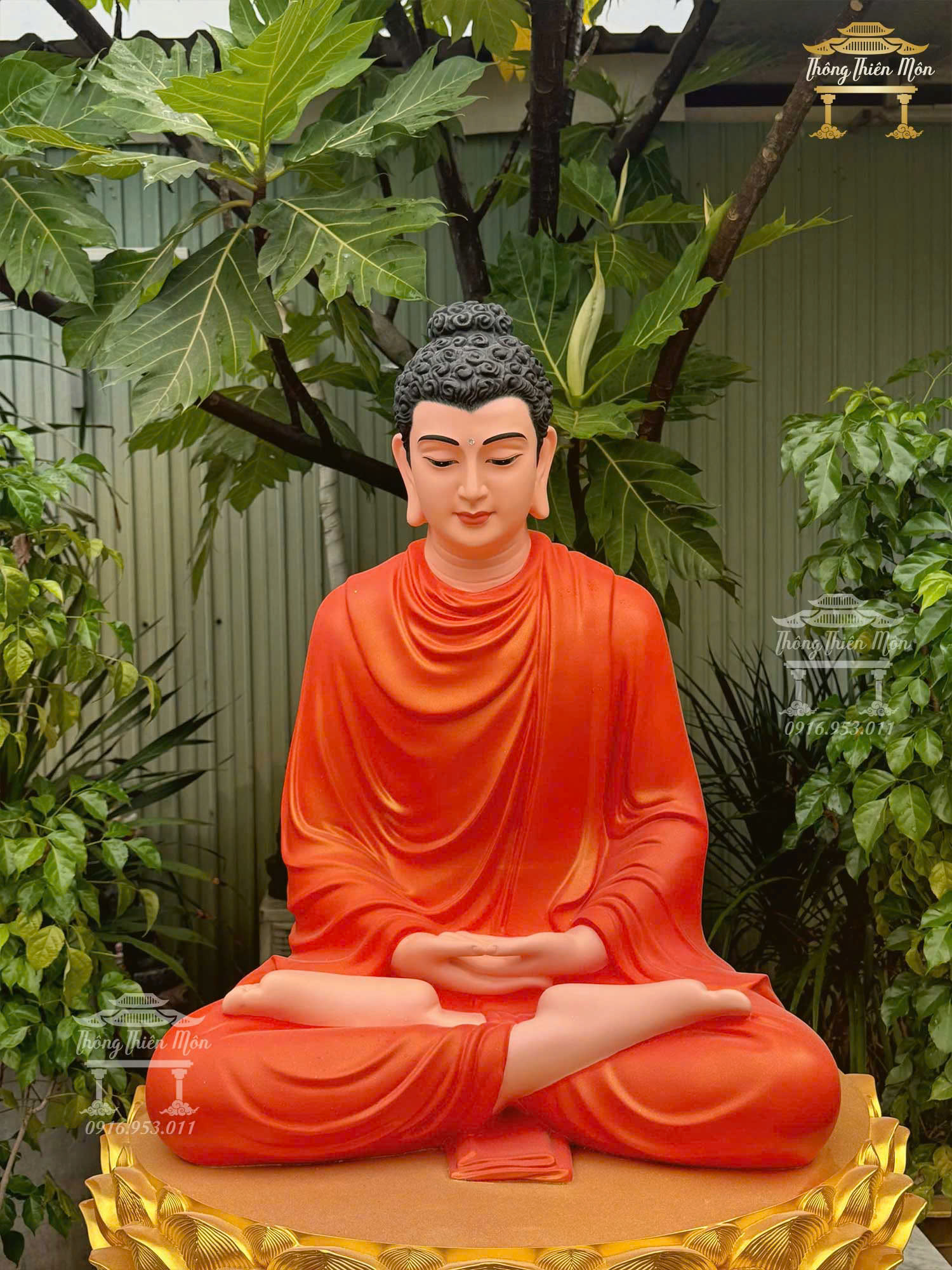 Tôn tượng Bổn Sư Thiền Định, Kích thước 100cm, Y cam tươi, đế sen nhũ vàng