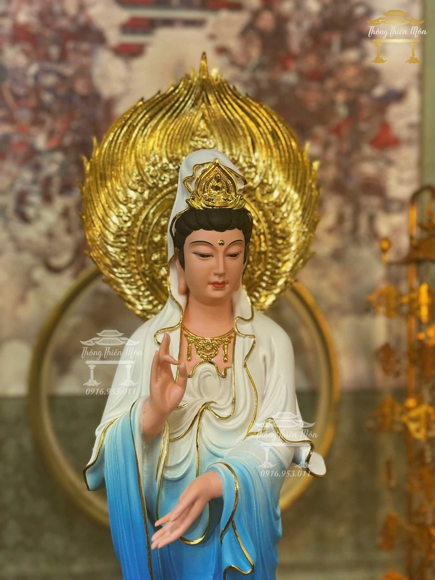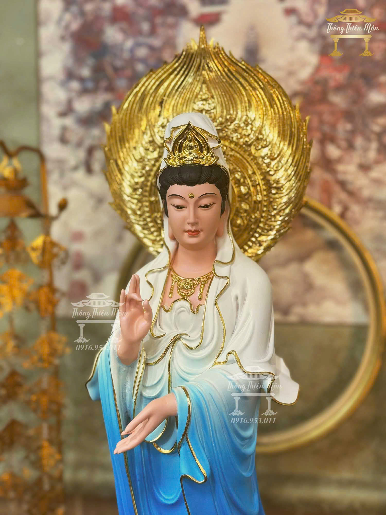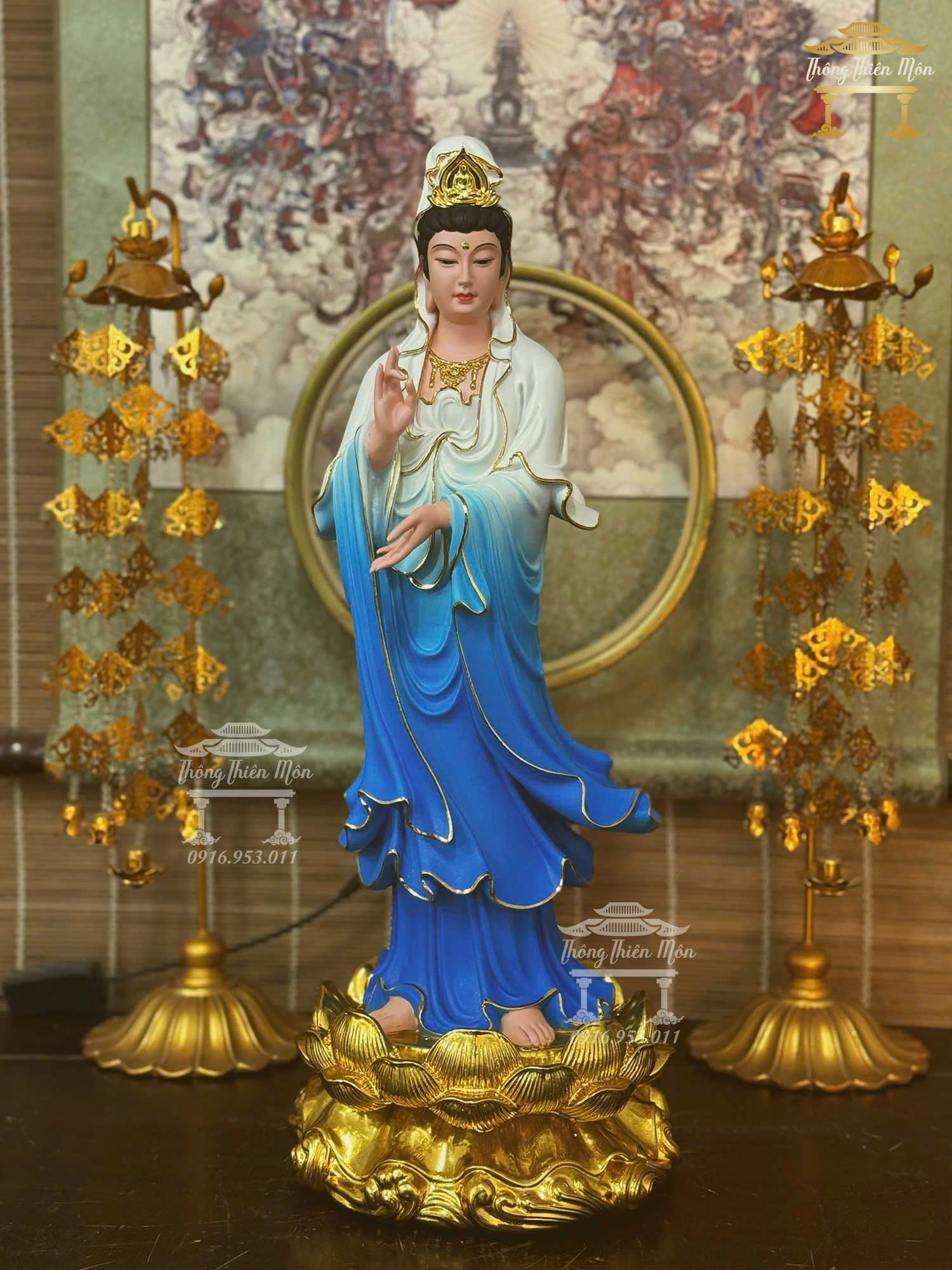 Tượng Quan Âm Bồ Tát, Kích thước 50cm, Màu xanh, Có lá đề