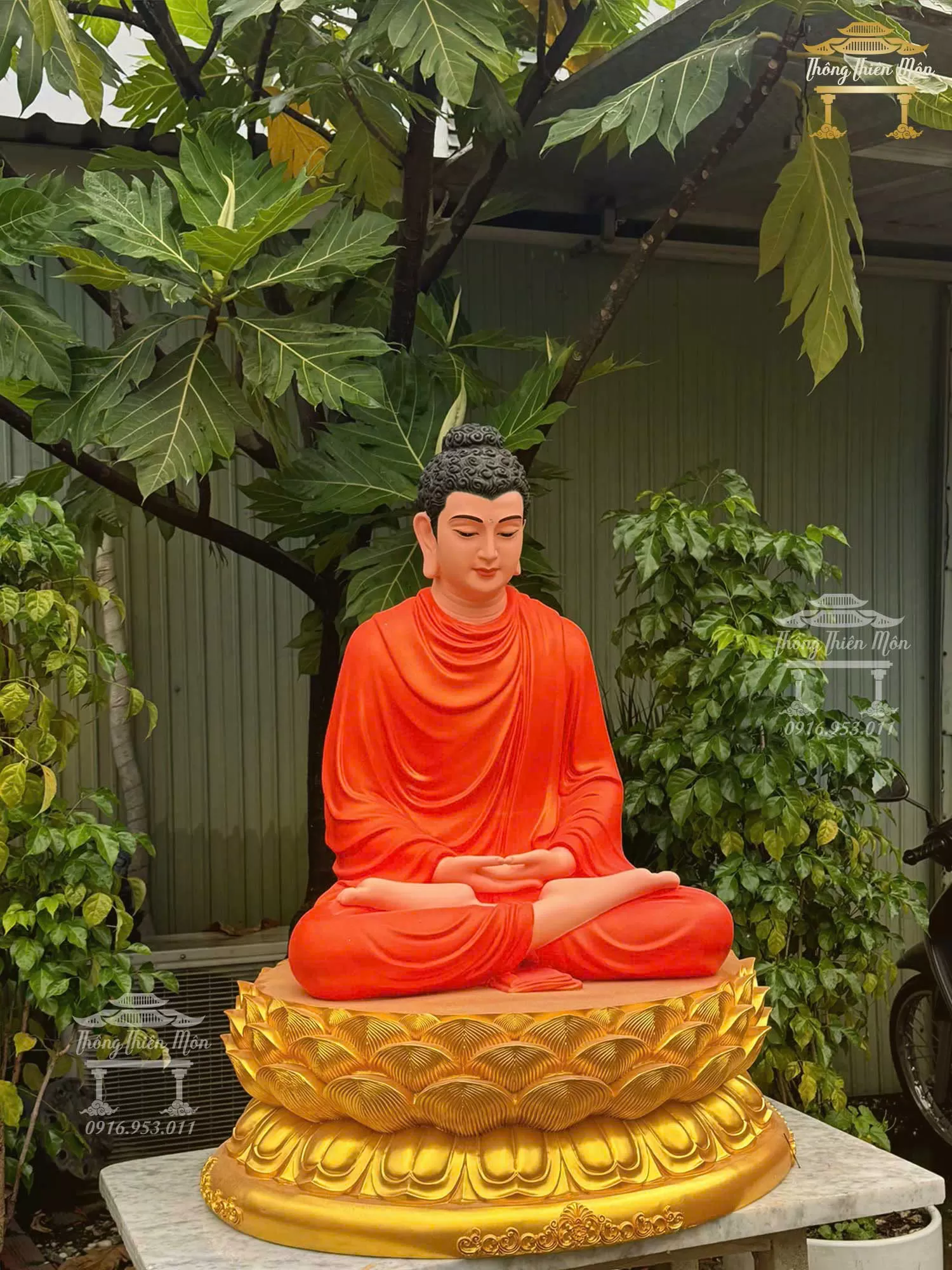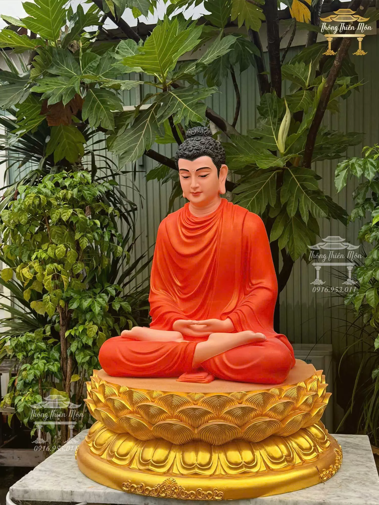 Tôn tượng Bổn Sư Thiền Định, Kích thước 100cm, Y cam tươi, đế sen nhũ vàng