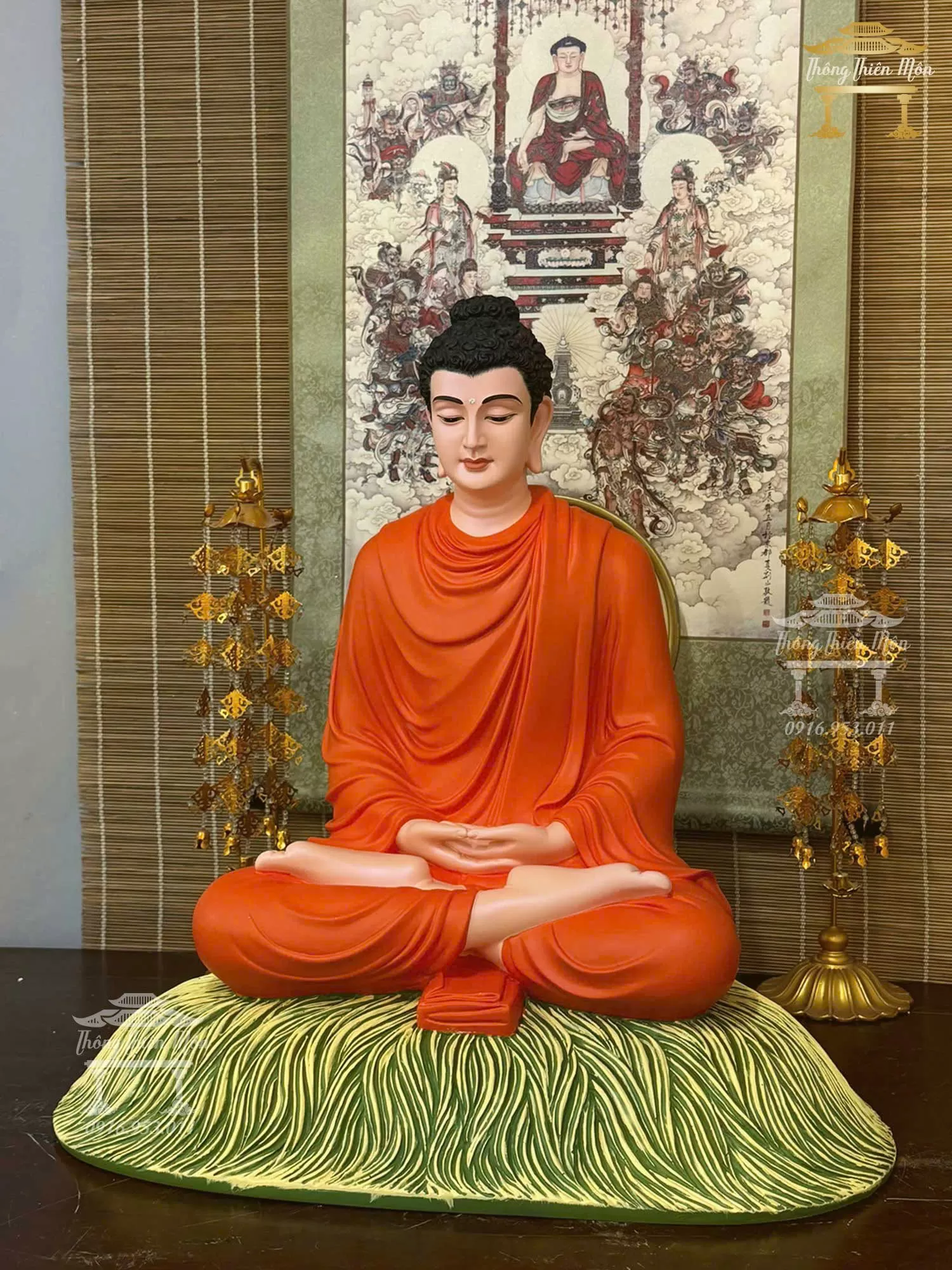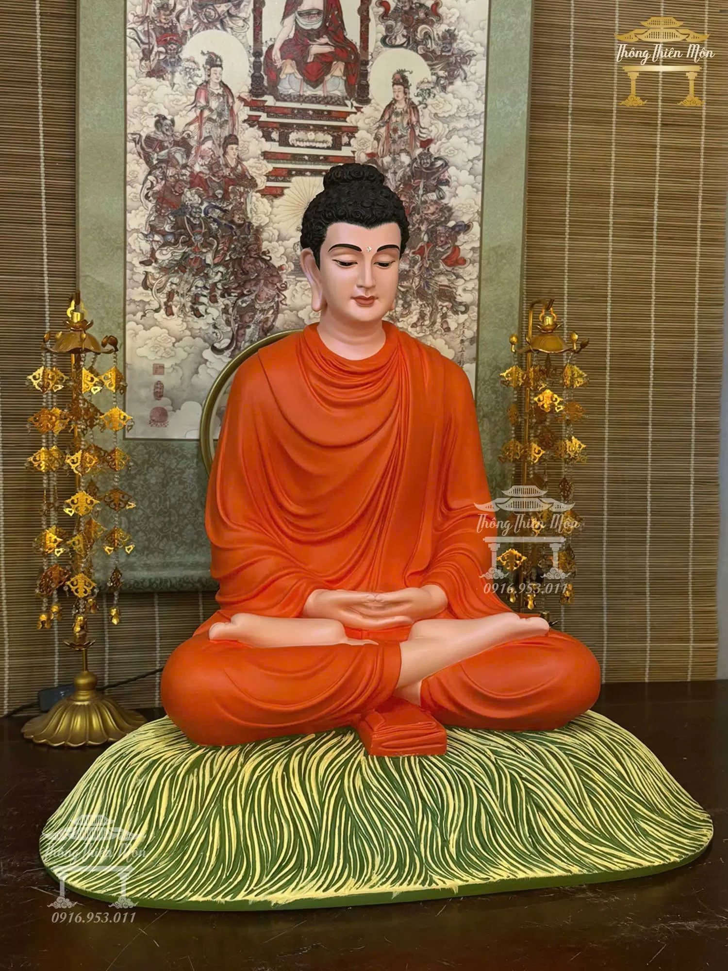 Tôn tượng Bổn Sư Thiền Định, Kích thước 60cm, Y cam đỏ, đế rơm xanh