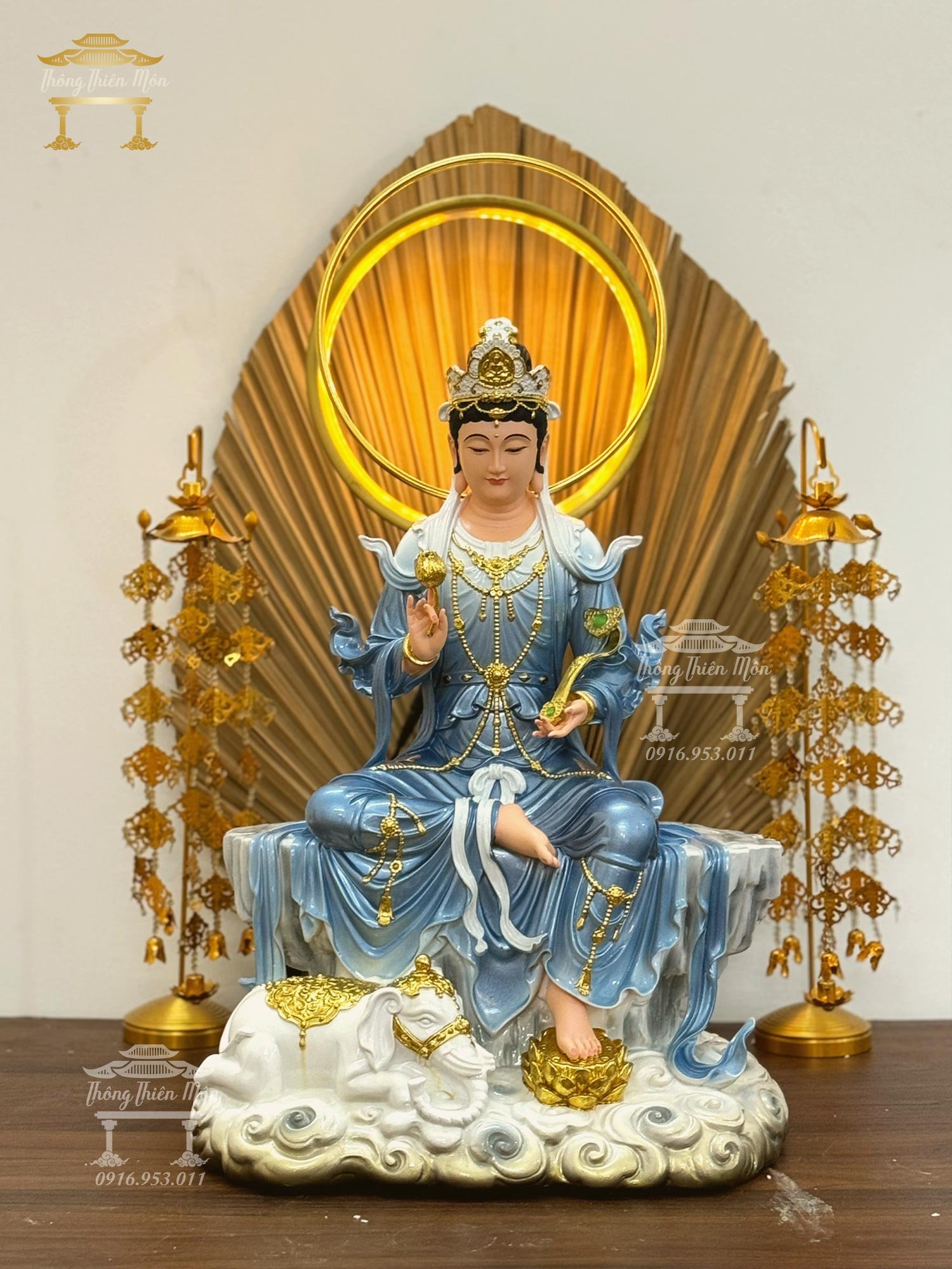 Tượng Văn Thù - Phổ Hiền Bồ Tát, Kích thước 48cm, Phối màu xanh