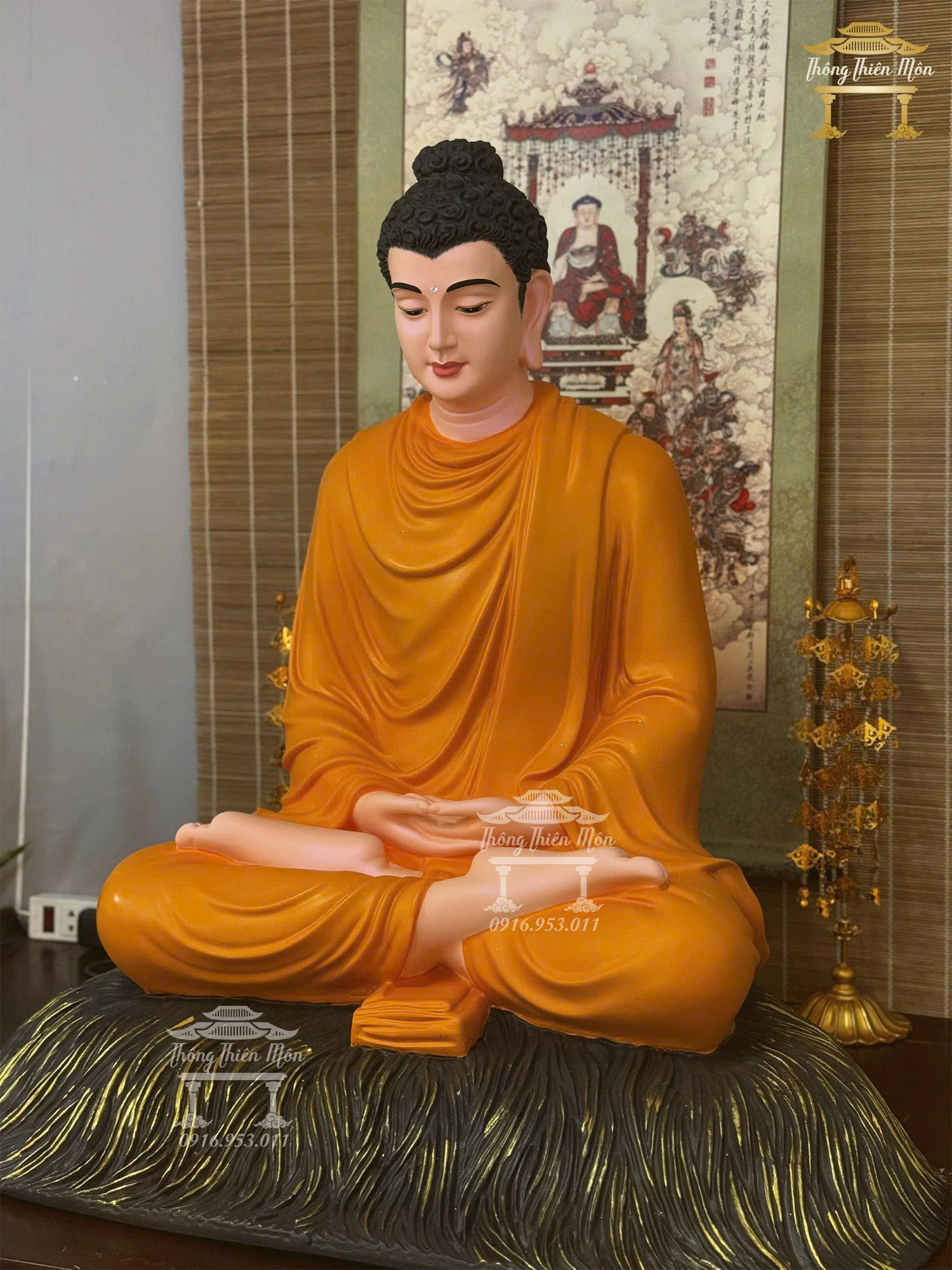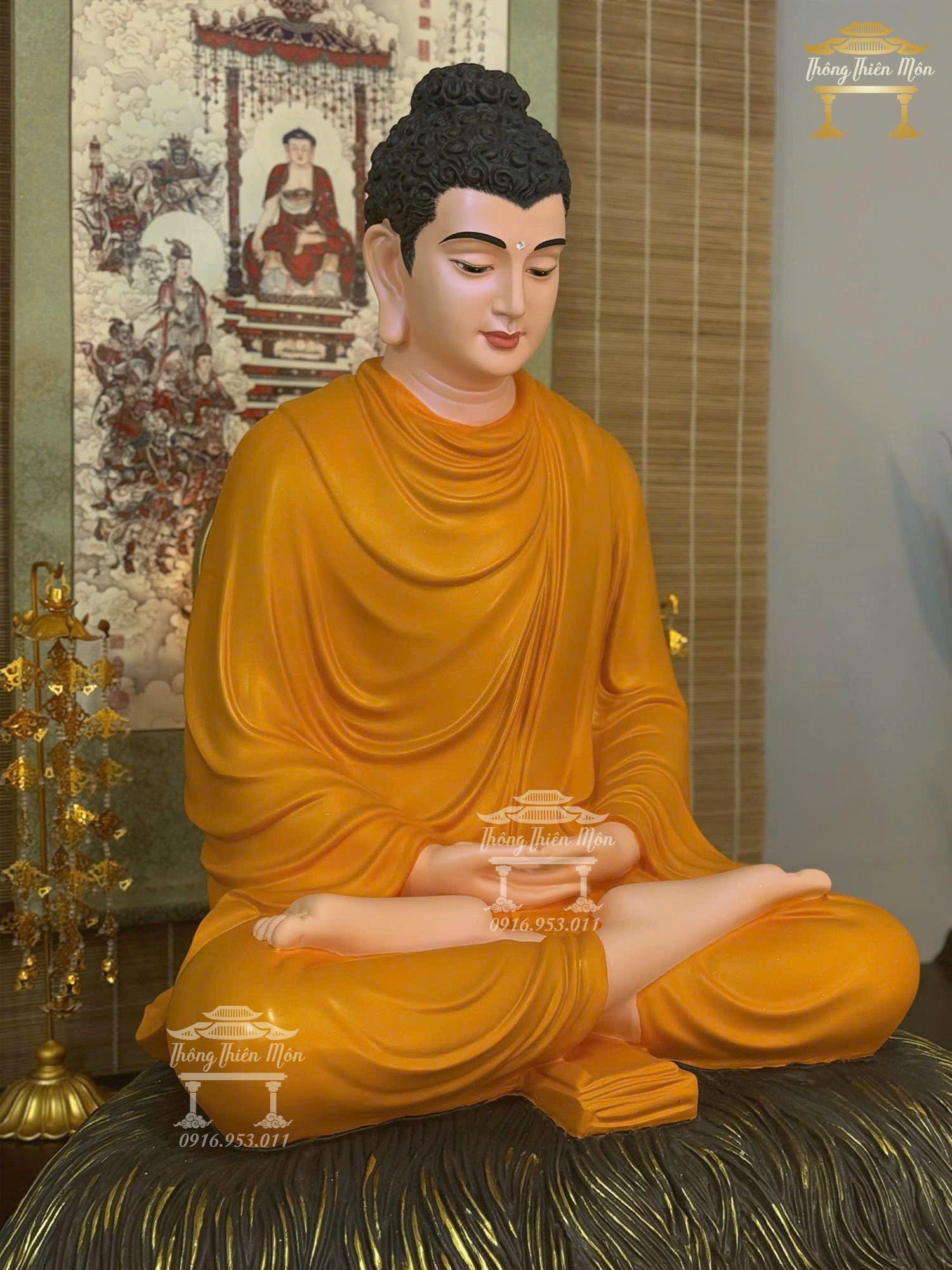 Tôn tượng Bổn Sư Thiền Định, Kích thước 85cm. Màu cam tươi, đế rơm nâu đồng
