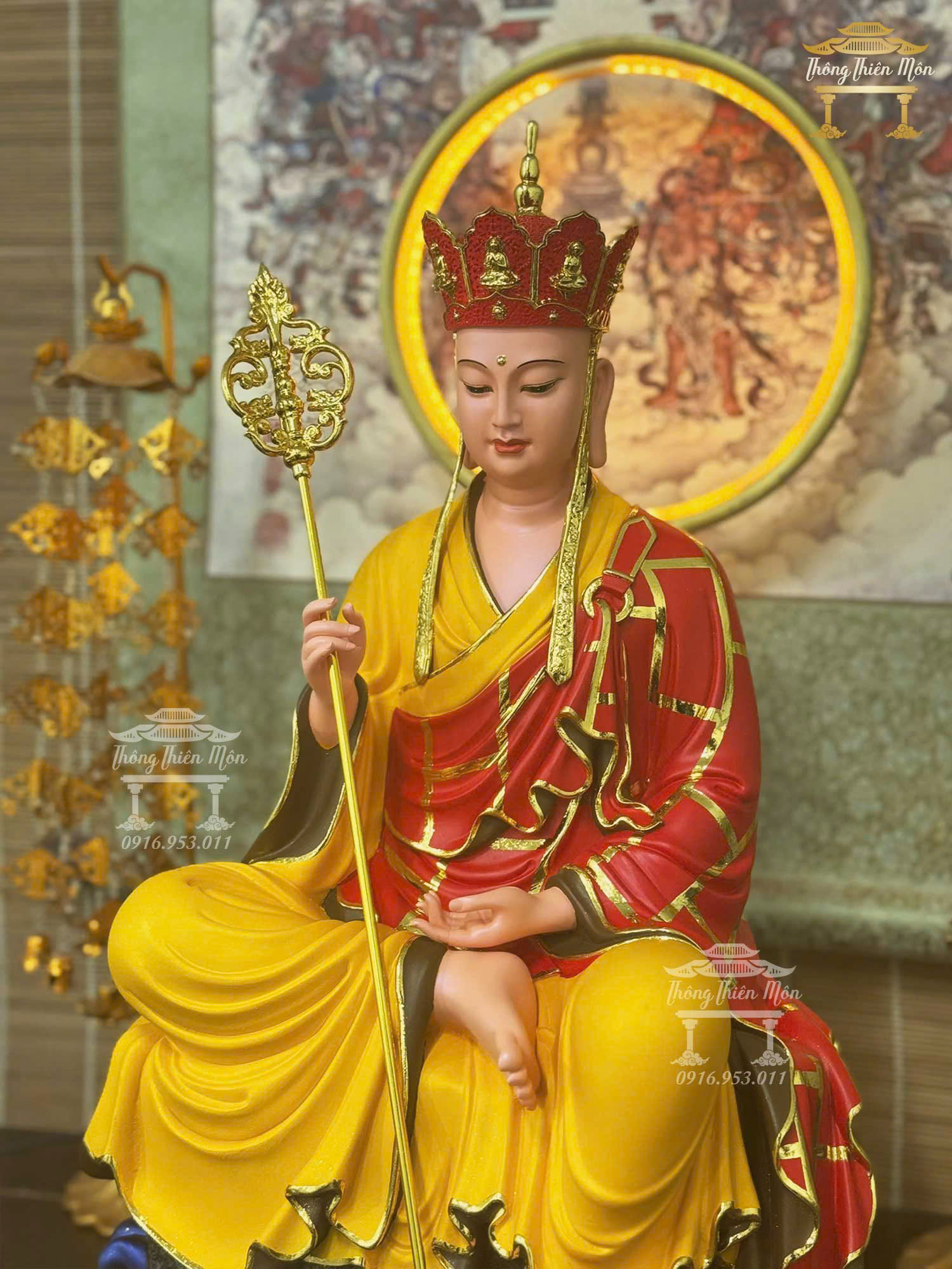 Tôn tượng Địa Tạng Tự Tại Bồ Tát, Kích thước 48cm, Y phước điền phối đỏ vàng