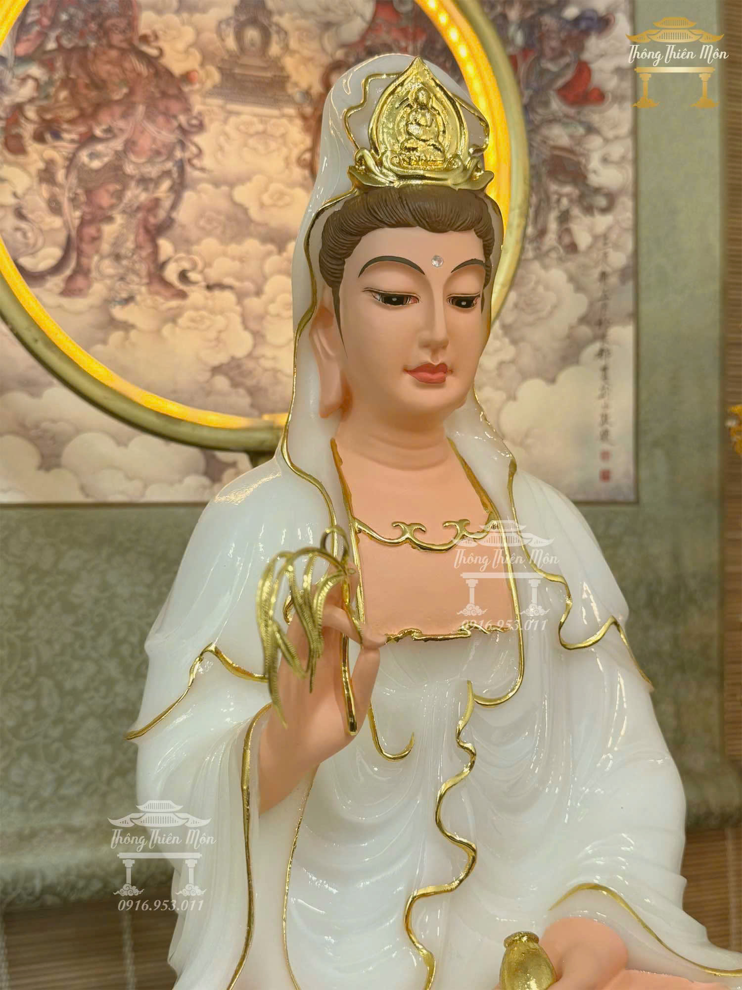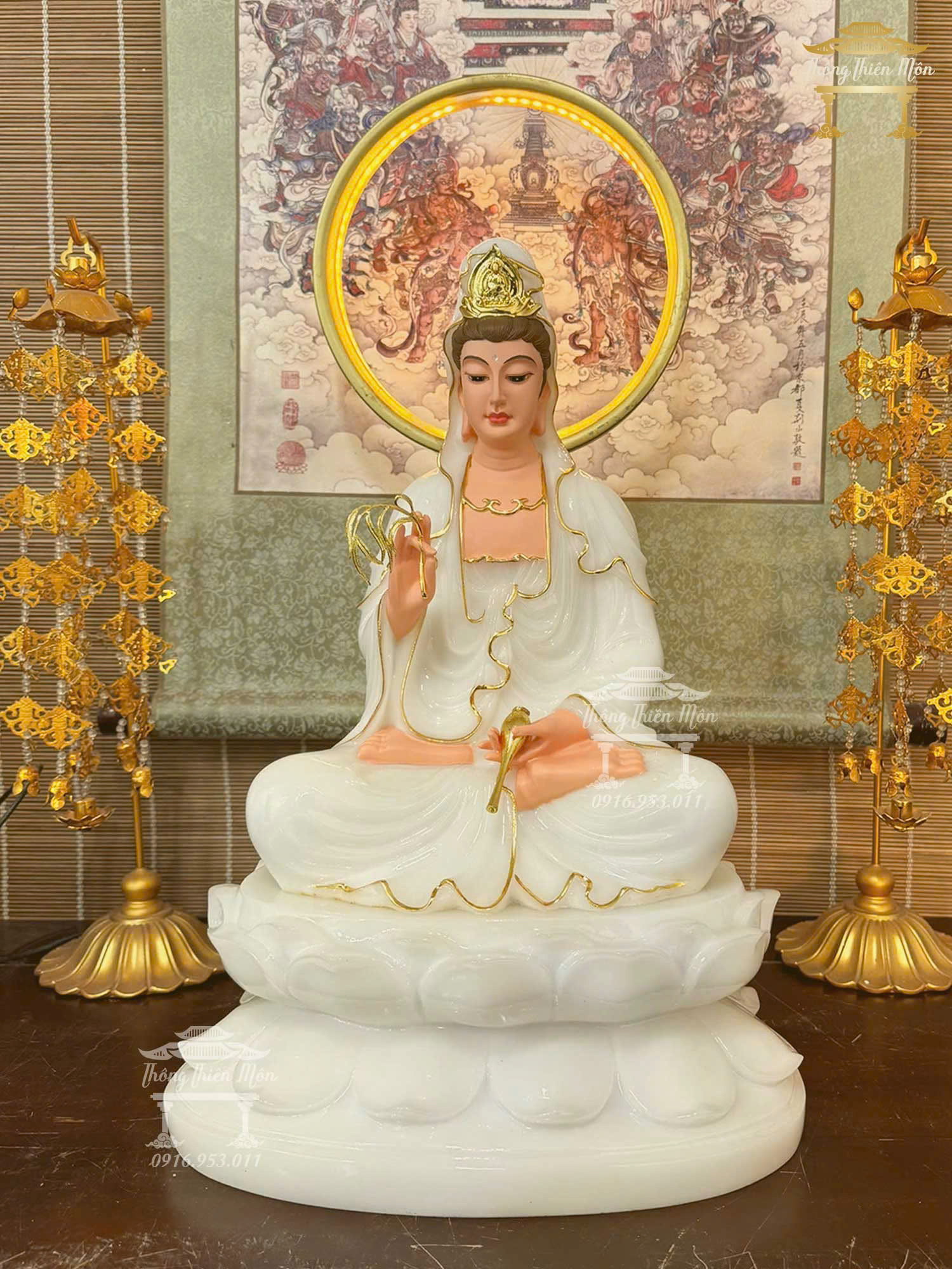 • Tượng được làm bằng chất liệu Bột Bạch Ngọc (Màu y áo + đế sen sẽ là màu tự nhiên của chất liệu)
