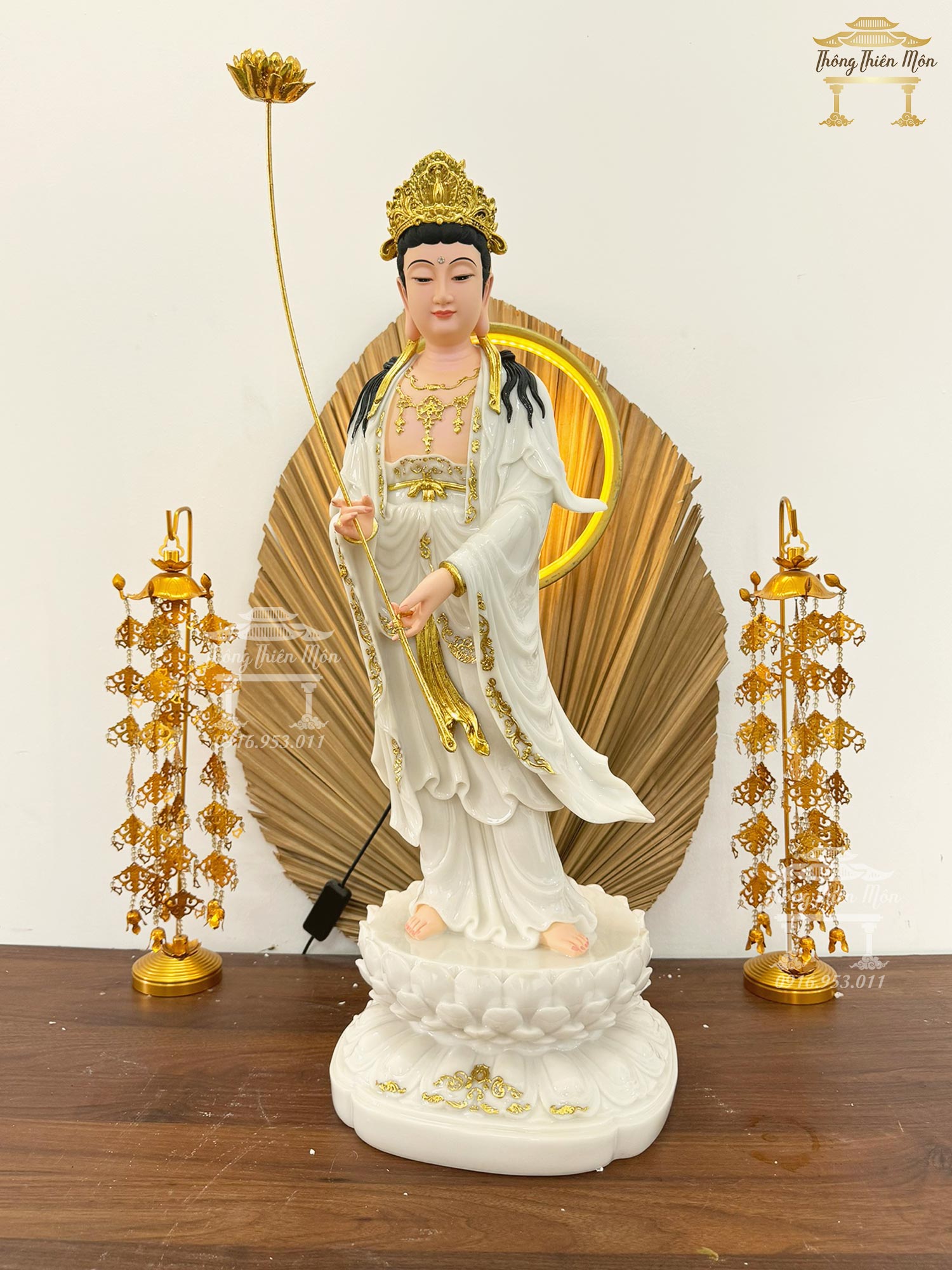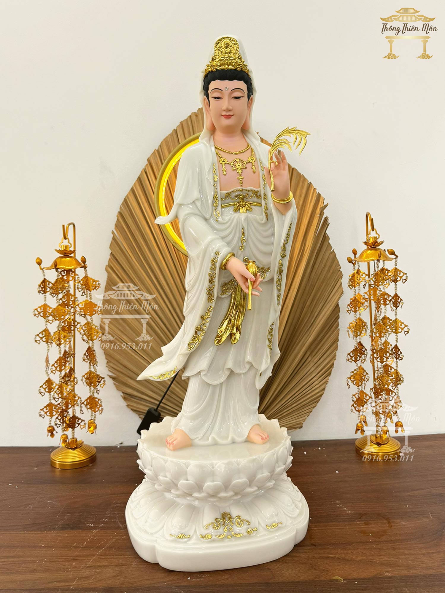 • Tượng được làm bằng: Chất liệu Bạch Ngọc, màu sắc sẽ là màu tự nhiên của chất liệu, kết hợp viền vàng