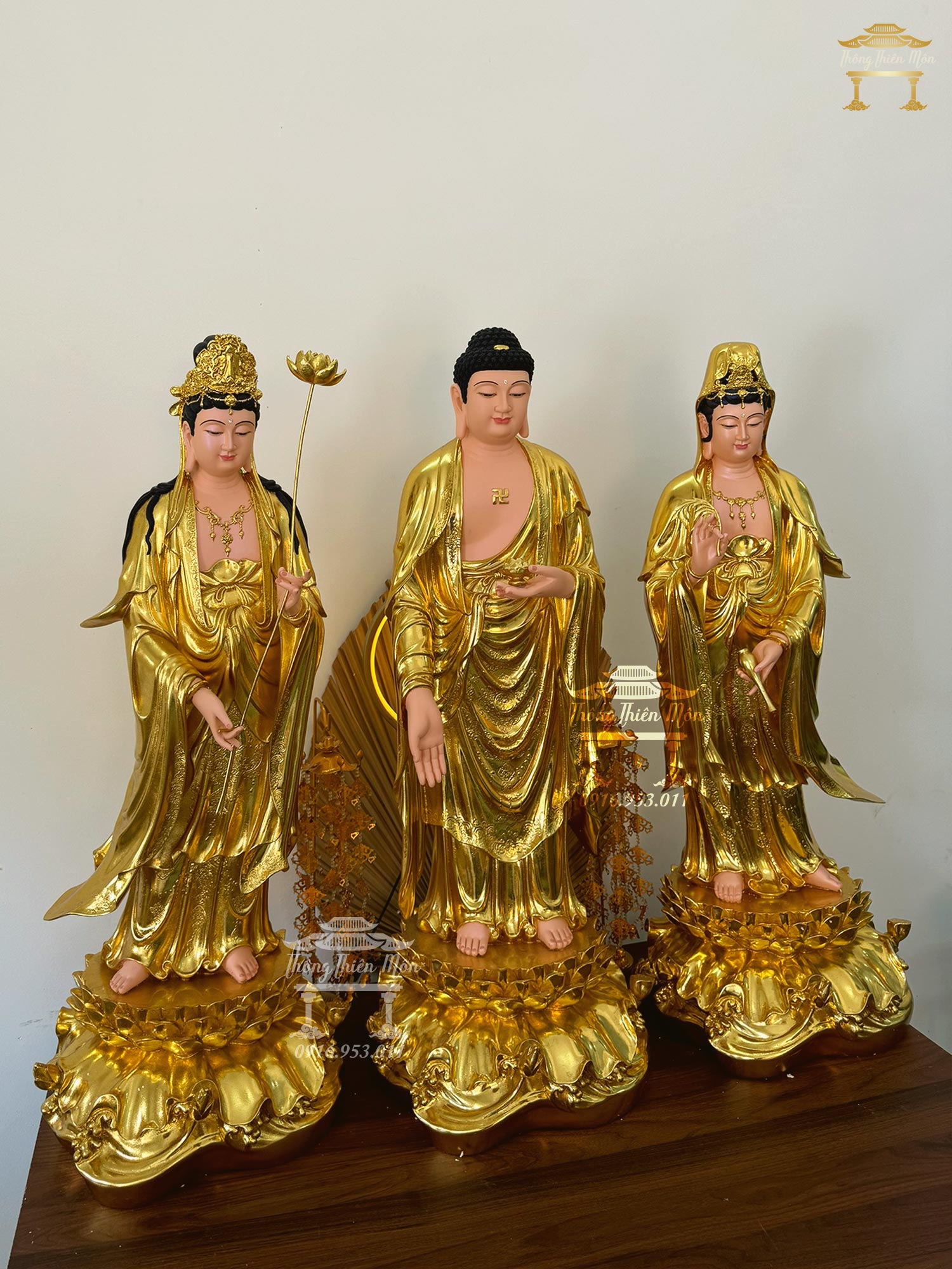 • Bộ Tượng Tây Phương Tam Thánh đứng đài sen, mạ vàng, màu da hồng phấn