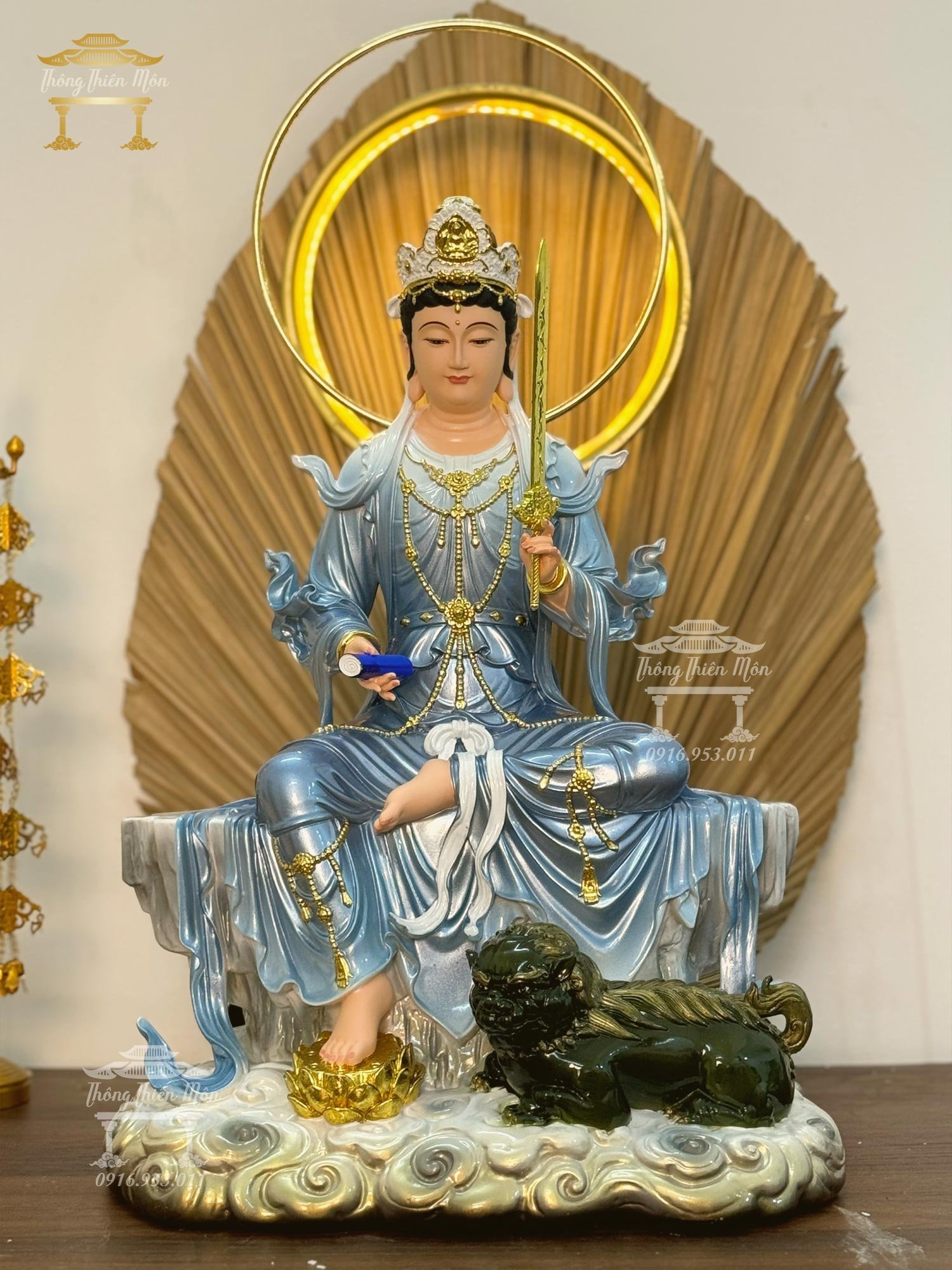 Tượng Văn Thù - Phổ Hiền Bồ Tát, Kích thước 48cm, Phối màu xanh