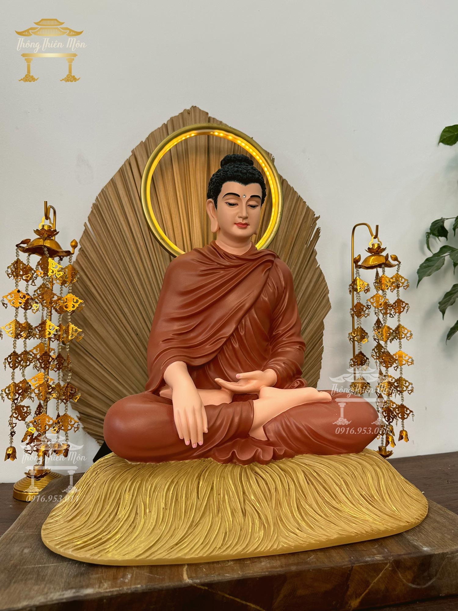 • ​Tôn Tượng Ngồi đế cỏ, y màu gốm, đế vàng rơm