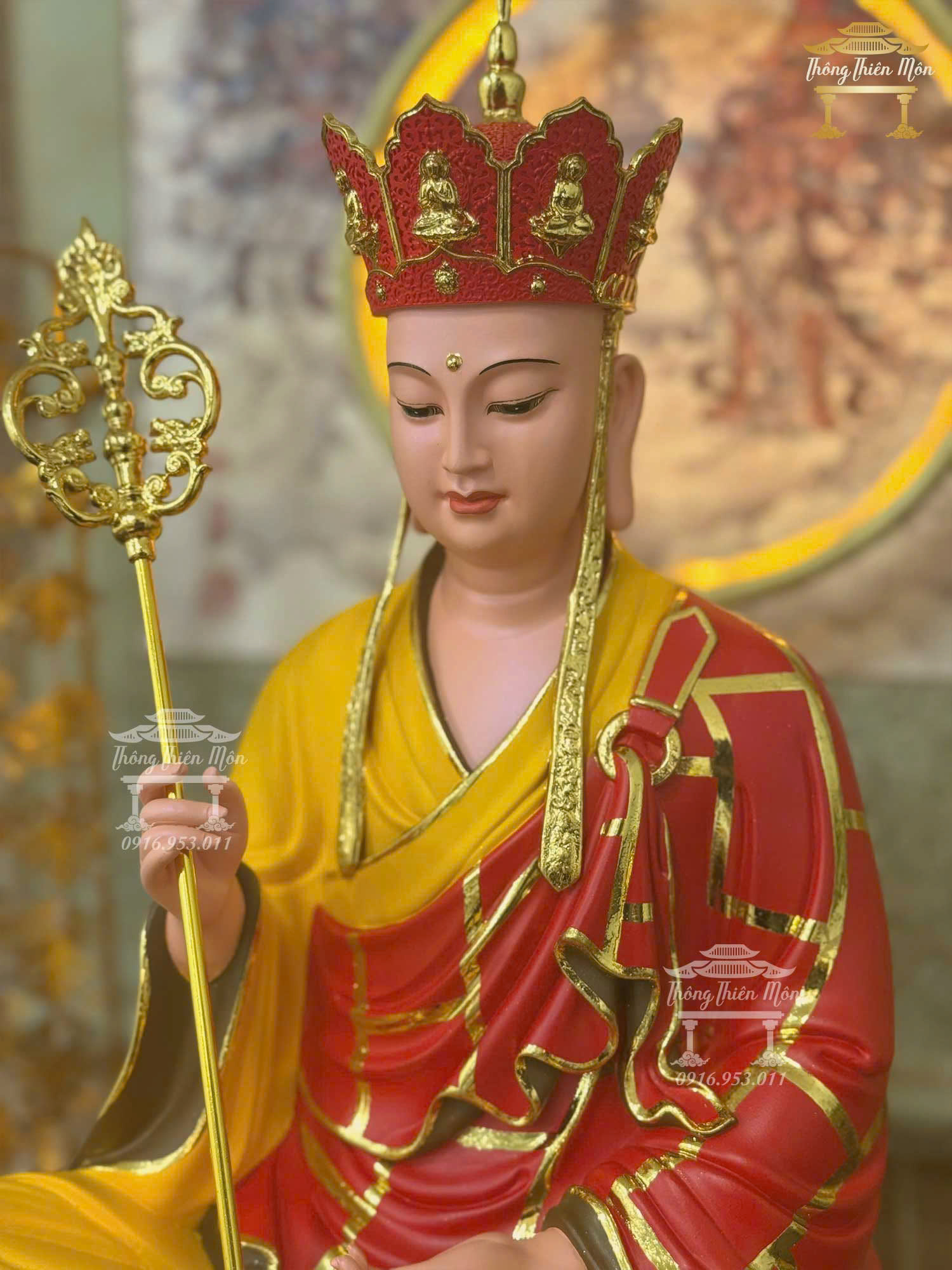 Tôn tượng Địa Tạng Tự Tại Bồ Tát, Kích thước 48cm, Y phước điền phối đỏ vàng