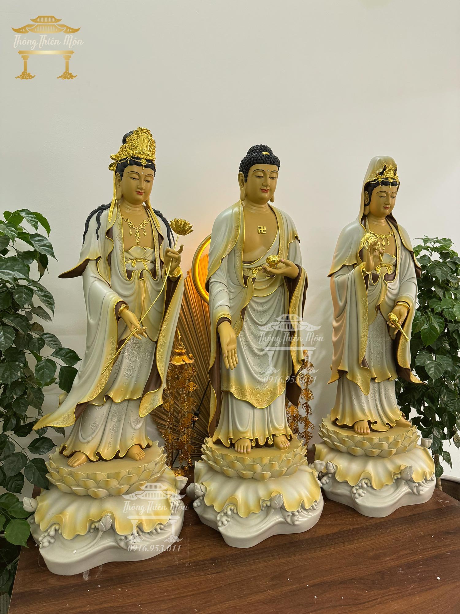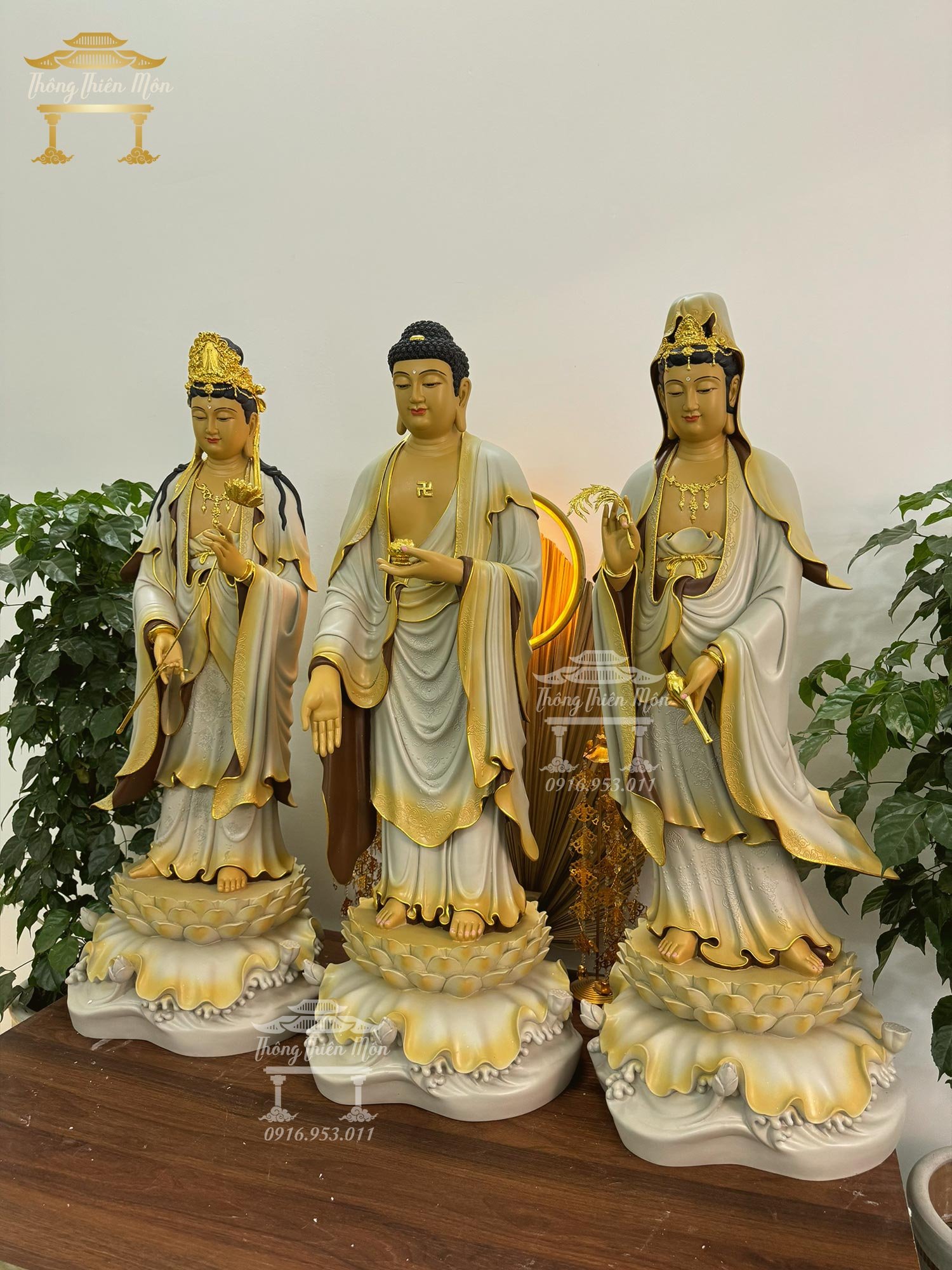 Tôn tượng Tây Phương Tam Thánh - Kích thước 90cm - Màu xám độc quyền - Đường viền mạ vàng