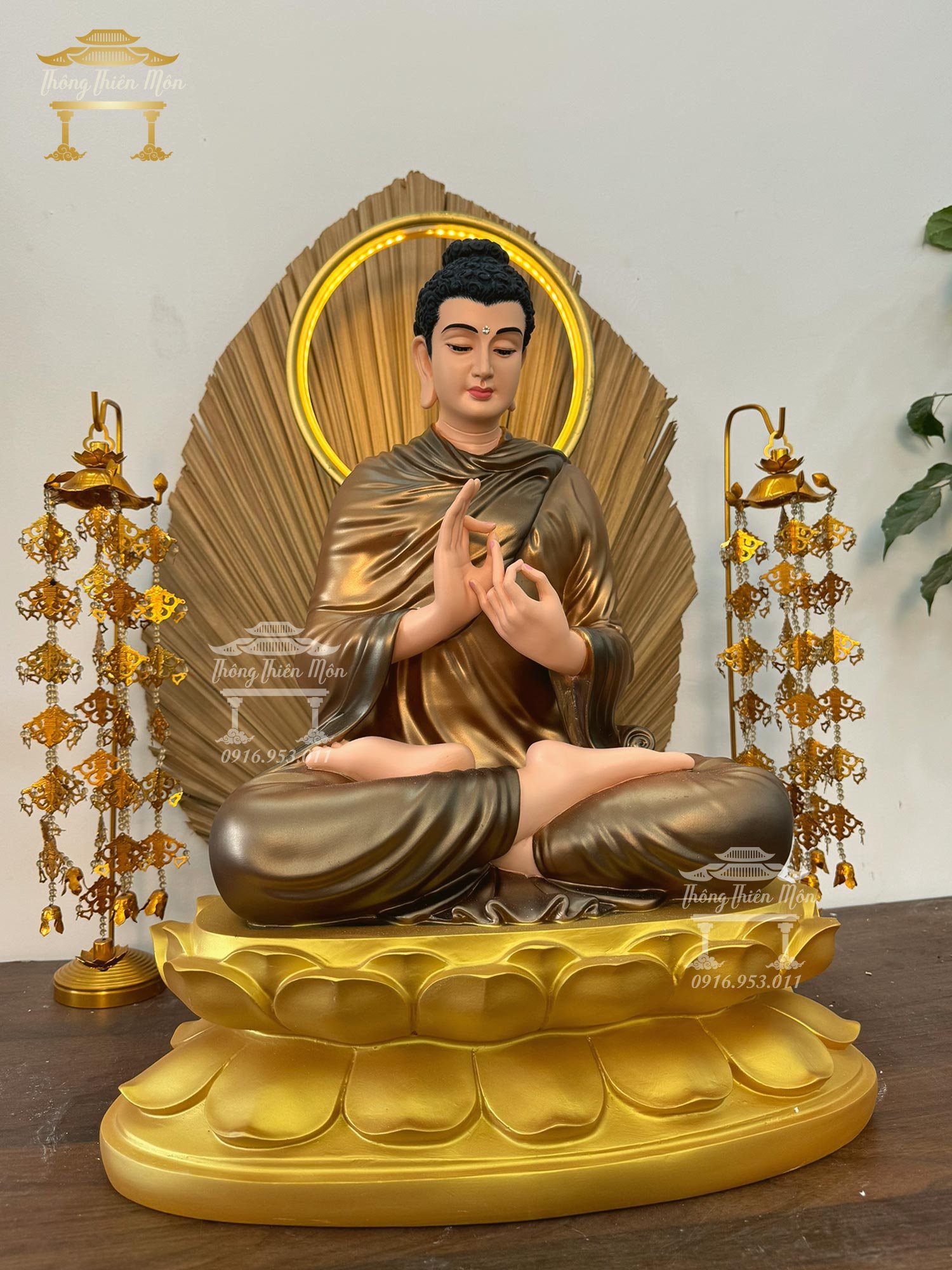 • Tôn Tượng Ngồi đế sen, y áo màu nâu, đế sen vàng nhũ