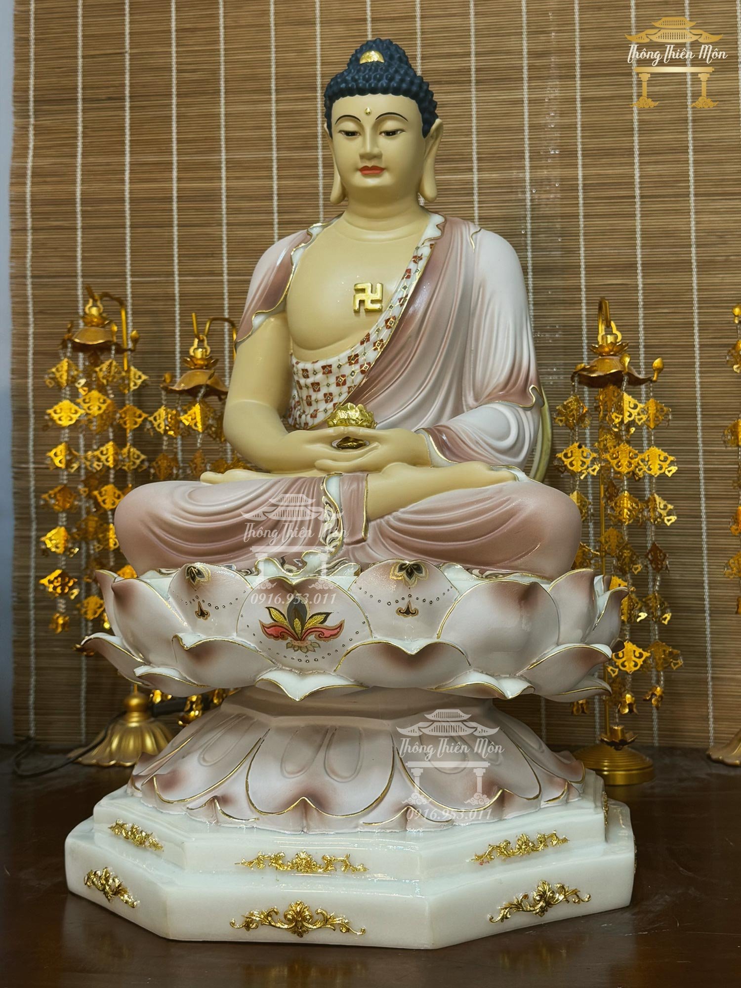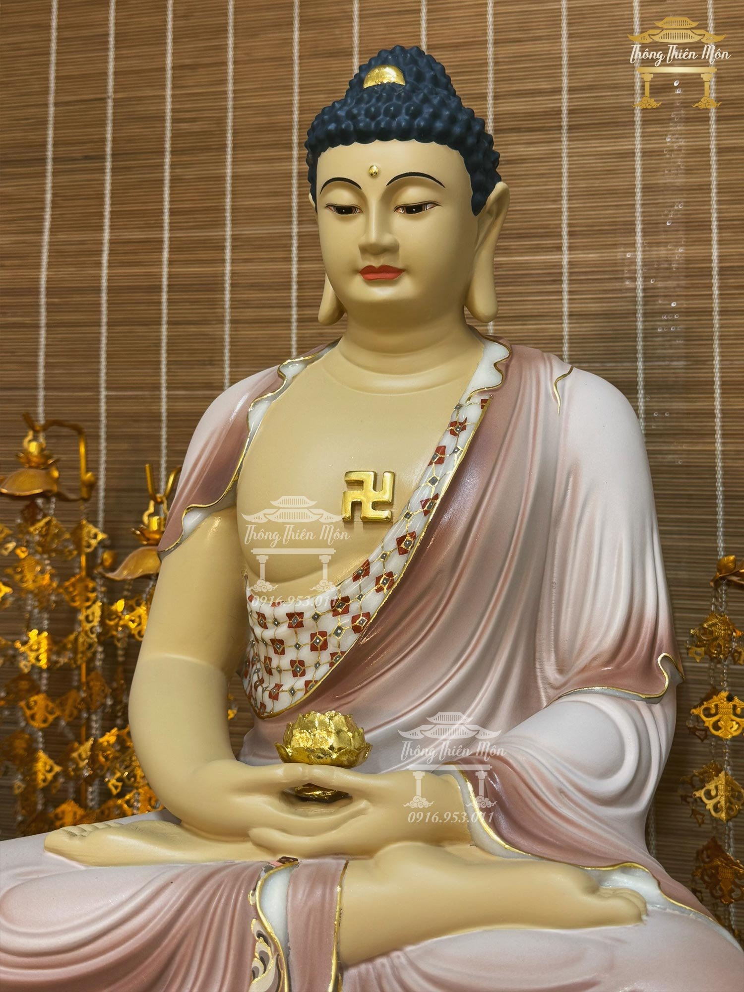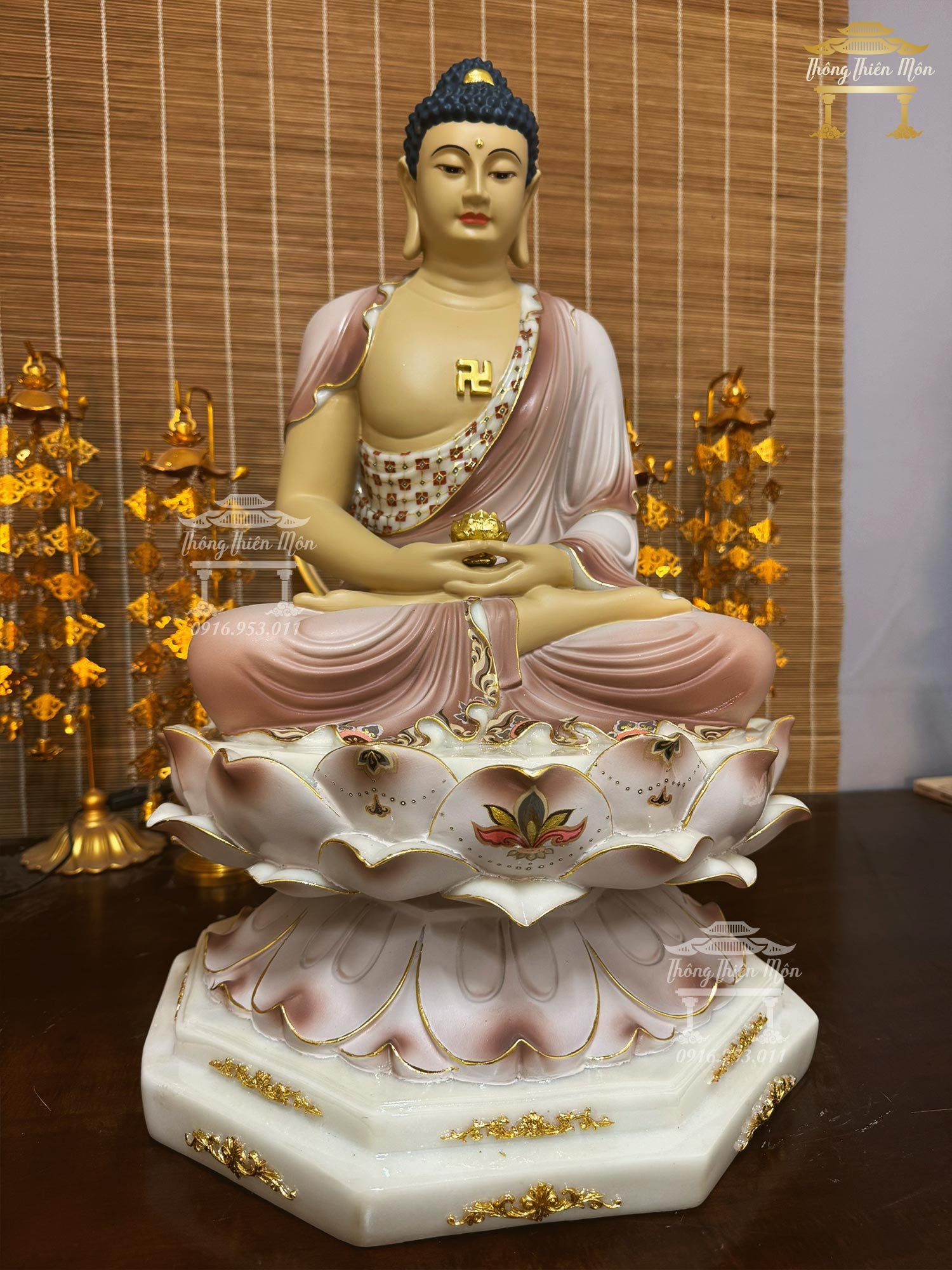 • Tôn Tượng Ngồi đế sen, sơn phối màu lạ mắc, viền vàng, vẽ gấm, vân đá rõ