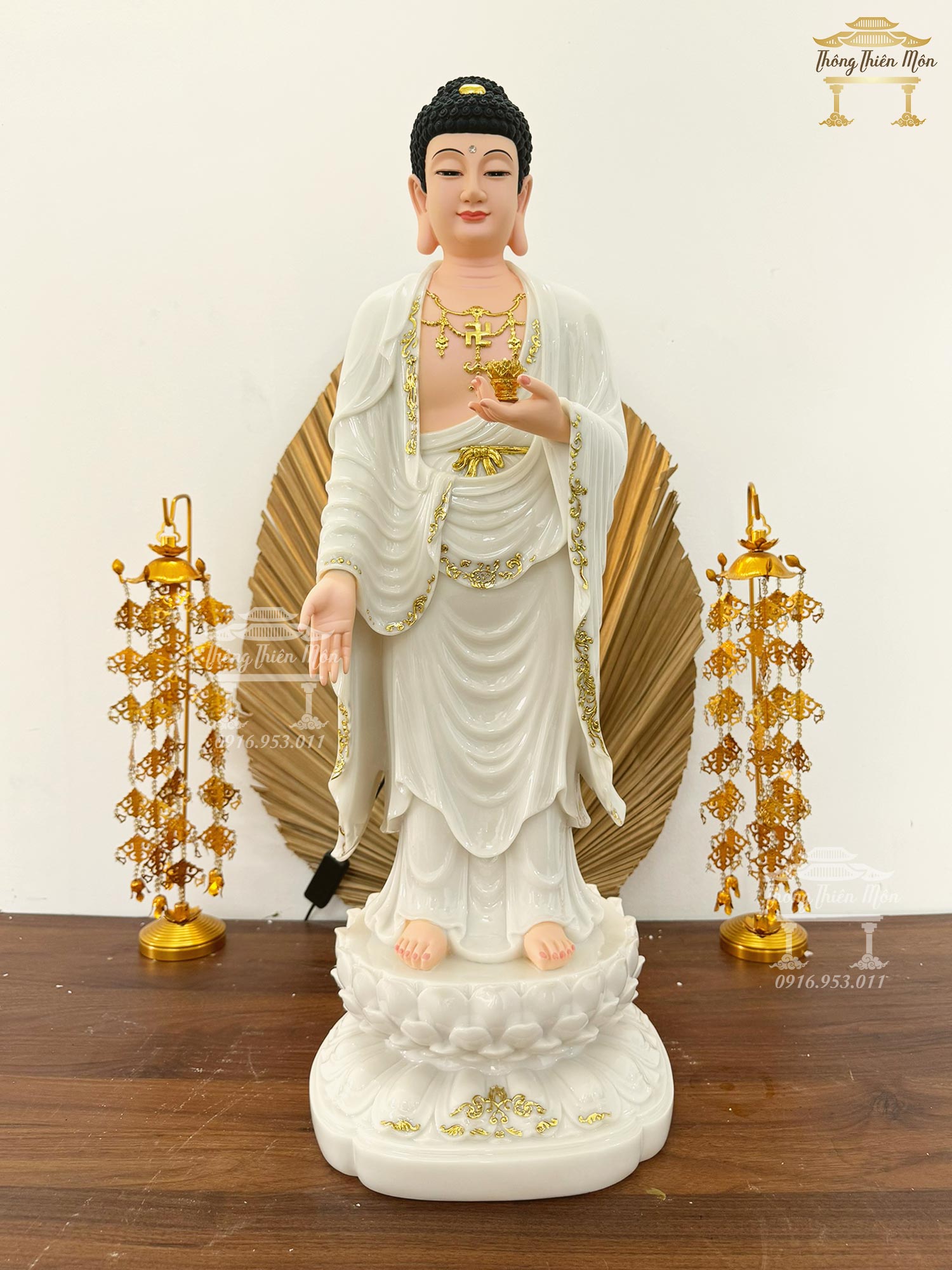 • Tượng được làm bằng: Chất liệu Bạch Ngọc, màu sắc sẽ là màu tự nhiên của chất liệu, kết hợp viền vàng
