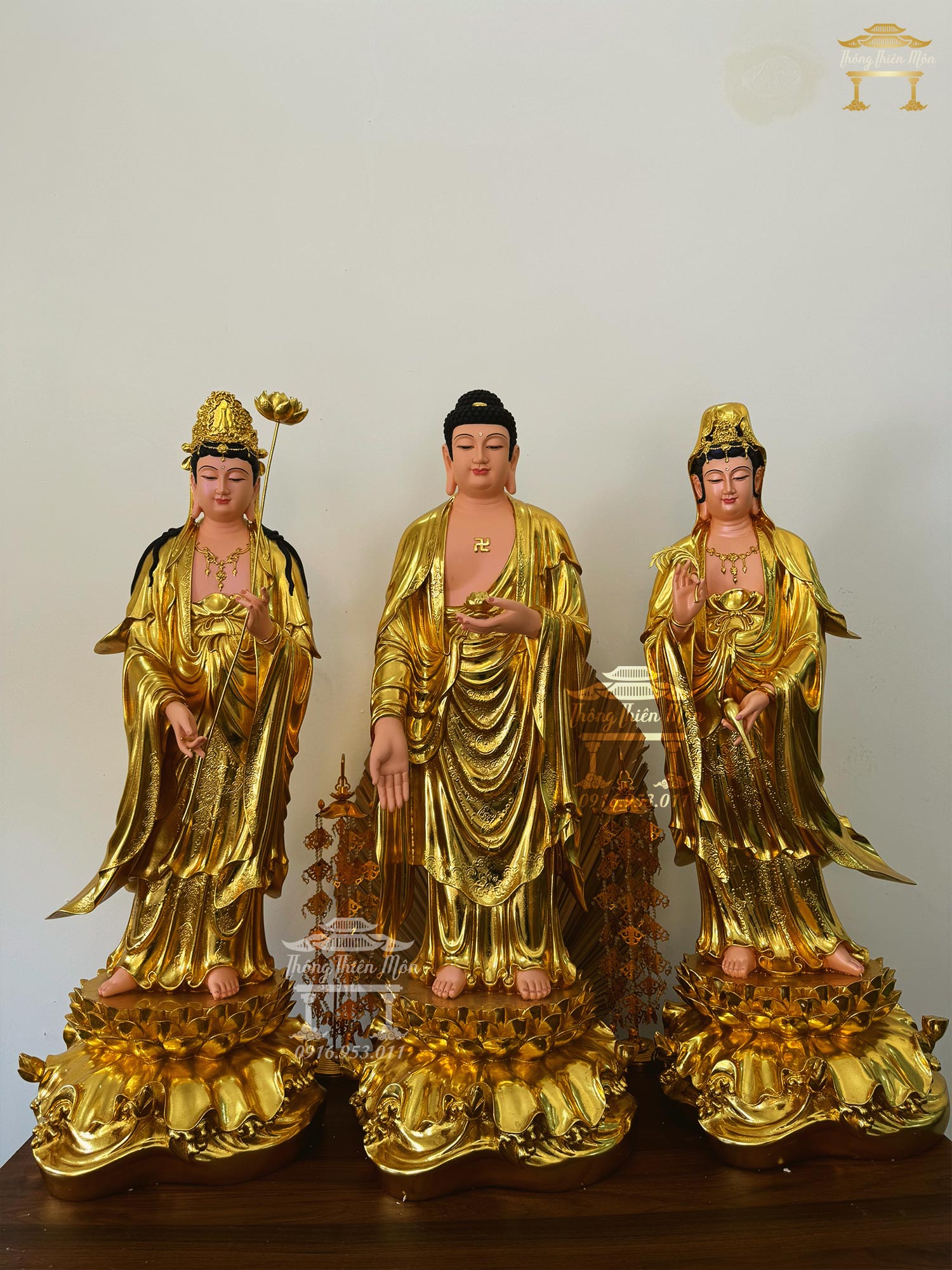 • Bộ Tượng Tây Phương Tam Thánh đứng đài sen, mạ vàng, màu da hồng phấn